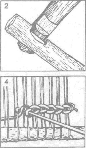 Рама готова. Натяните на нее хлопчатобумажную пряжу, обмотав ее вокруг верхней и нижней перекладин. Для коврика размером 65x85 см понадобятся 132 нитевые основы, натянутые на расстоянии 1 см друг от друга. Чтобы зафиксировать нити, сделайте предварительно маленькие зарубки с внешних сторон верхней и нижней перекладин. Следующий этап — возьмите шнур и свяжите крючком цепочку, захватывая ею нити основы. Для этого образуйте из шнура петлю, вставьте в нее вязальный крючок и подведите к двум первым нитям основы с правой стороны. Рабочая нить шнура должна находиться все время под основой. Две первые нити основы захватите петлей и крючком вытяните рабочую нить шнура через эту петлю. Вновь образованной петлей обхватите две следующие нити основы и опять вытяните через нее шнур (см. рис. 4). Так делайте, пока не дойдете до конца нитевой основы. В конце закрепите. Связанная таким образом цепочка соберет все нити в одной плоскости и будет держать край изделия. После этого начните формировать холст, протягивая шнур или тесьму змейкой через нити основы (начало закрепите). Проложив первый ряд тесьмы, завяжите на ней узлом между каждой нитью основы заготовленные вами лоскутки. Когда ряд будет закончен, проложите тесьму в обратном направлении так, чтобы она обвивала нити основы в шахматном порядке по отношению к предыдущему ряду, и завяжите на ней лоскутки. Каждый новый ряд тесьмы с нанизанными лоскутками плотно сдвигайте к предыдущему. Так работайте, пока не достигнете желаемой длины коврика. После чего свяжите крючком цепочку из шнура, которая будет держать край изделия. Разрежьте на перекладинах концы нитевой основы, освободив таким образом коврик от ткацкой рамы. Первую нить основы завяжите на два узла с третьей, вторую — с четвертой и т.д. Ножницами подровняйте бахрому из лоскутков до нужной длины. Коврик готов.