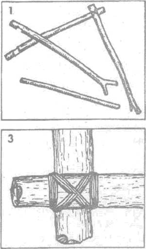Кусочки ткани нарежьте полосками шириной 4 см. Затем намотайте их на шаблон из толстого картона, распределив равномерно по всей длине шаблона. Разрежьте полоски на сгибах — и лоскутки размером 4x13 см готовы. Теперь можете приступить к изготовлению ткацкой рамы. Для нее понадобятся 2 прочные палки с разветвленными концами и 2 такие же прочные поперечные перекладины (см. рис. 1). С обеих сторон нижней перекладины и на неразветвленных концах боковых вырежьте отверстия для крестообразного соединения (см. рис. 2), чтобы палки вошли одна в другую. Скрепите их, как крестовину для елки. Затем обвяжите прочным шнуром (см. рис. 3). Так будет зафиксирована ширина рамы. Верхнюю перекладину вставьте в оба разветвленных конца.
